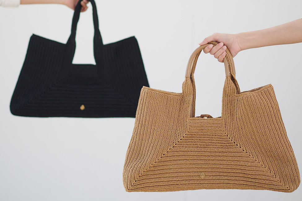シンプルゆえに、キメの揃った縦と横の美しい編み目が際立つ、肩あたりのいい柔らかな山羊革のストラップと物を投げ入れてもビクともしない耐久性。収納力という機能もきちんと満たすフルサイズの「Praia」。